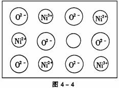(2)天然和绝大部分人工制备的晶体都存在各种缺陷,例如在某氧化镍晶体中就存在如图4-4所示的缺陷:一个Ni2+空缺,另有两个Ni2+被两个Ni3+所取代。其结果晶体仍呈电中性,但化合物中Ni和O的比值却发生了变化。某氧化镍样品组成为Ni0.97O,试计算该晶体中Ni3+与Ni2+的离子数之比。