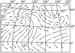 读世界某区域某月盛行风示意图,回答15-16题。
