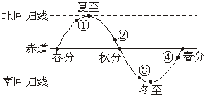 2、下图“太阳直射点在地球表面移动示意图”中的①、②、③、④四处,与日历所示之日太阳直射点位置最接近的是( )