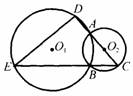 8.如图,⊙O1与⊙O2交于点A,B,延长⊙O2的直径CA交⊙O1于点D,延长⊙O2的弦CB交⊙O1于点E。已知AC= 6,AD:BC:BE=l:l:5,则DE的长是______________ 。