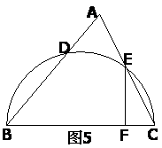 2. 已知:如图5,以△ABC的BC边为直径的半圆交AB于D,交AC于E,过E点作EF⊥BC,垂足为F,且BF:FC=5:1,AB=8,AE=2.求EC的长.![]()