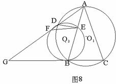3.已知,如图8,△ABC内接于⊙O1,AB=AC,⊙O2与BC相切于点B,与AB相交于点E,与⊙O1相交于点D,直线AD交⊙O2于点F,交CB的延长线于点G.求证: