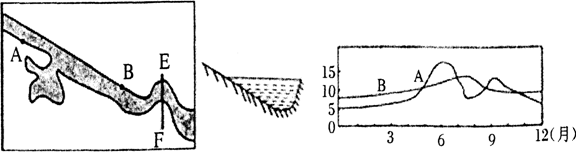 下图中甲是“我国东部河流某河段示意图’’,乙是"EF河段河床示意图",丙是“河流A、B两水文站测得的水位变化图”。据此完成17-19题。