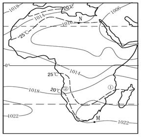 读图9“非洲某月海平面气压(单位:hPa)和非洲年平均气温分布图”,完成22-23题。