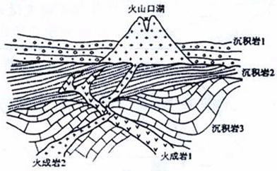 下图示意某地的沉积岩层与火成岩体(岩浆岩)的相互关系。回答17-18题。