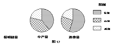 图12“中国东部、中部和西部地区1998年能源探明储量、生产量和消费量占全国的比重图”,回答13,14题。