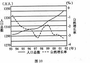 上海市1993年以来出生率在6‰以下,死亡率在8‰以下。图10是1993-2003年来上海市人口总数与自然增长率变化示意图,据此回答9-10题。