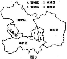 图3为北京行政区划图(习惯上把东城、西城、宣武、崇文四个区称为中心城区,石景山、丰台、海淀、朝阳四个区被称为近郊区;周边其他地区称为远郊区),表2为北京市1990和2000年各区常住人口统计表,读图表完成14-16题。
