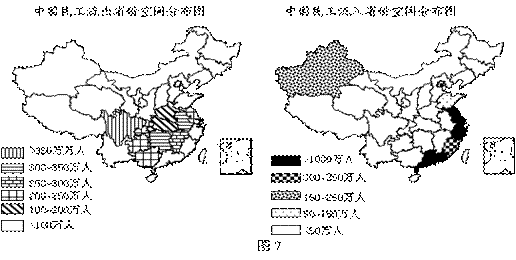 2个来自农村,2003年我国外出务工的农民达1.14亿。读图7完成17-18题。![]()