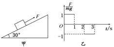 4.(2010·盐城调研)如图3甲所示,在倾角为30°的足够长的光滑斜面上,有一质量为m的物体,受到沿斜面方向的力F作用,力F按图乙所示规律变化(图中纵坐标是F与mg的比值,力沿斜面向上为正).则物体运动的速度v随时间t变化的规律是图4中的(物体的初速度为零,重力加速度取10 m/s2) ( )