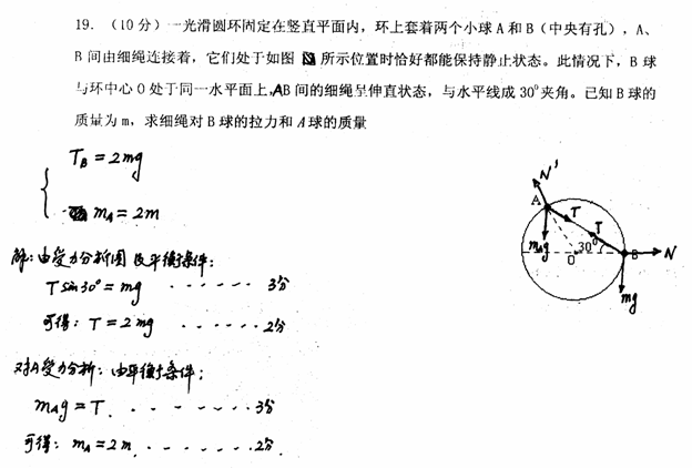 19.(10分)一光滑圆环固定在竖直平面内,环上套着两个小球A和B(中央有孔),A、B间由细绳连接着,它们处于如图所示位置时恰好都能保持静止状态。此情况下,B球与环中心O处于同一水平面上,AB间的细绳呈伸直状态,与水平线成300夹角。已知B球的质量为m,求细绳对B球的拉力和A球的质量