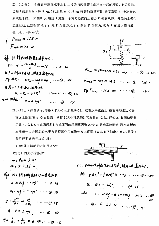 20.(12分)一个弹簧秤放在水平地面上,Q为与轻弹簧上端连在一起的秤盘,P为重物,已知P的质量M =10.5 kg,Q的质量 m =1.5 kg,弹簧的质量不计,劲度系数 k =800 N/m,系统处于静止.如图所示,现给P施加一个方向竖直向上的力F,使它从静止开始向上做匀加速运动,已知在前0.2 s内,F为变力,0.2 s 以后,F为恒力.求力F的最大值与最小值.(取g =10 m/s2)