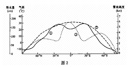 雪线高度是指终年积雪下限的海拔。下图表示全球不同纬度多年平均雪线高度、气温、降水量的分布。读图,回答16-18题。