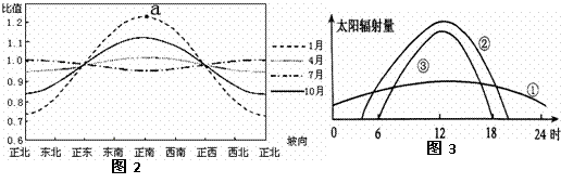 3. 图2表示27°N某地坡向(坡度为10°)对地表获得太阳辐射的影响,纵坐标表示该地坡面与地平面获得太阳辐射量的比值(仅考虑地球运动和地形因素)。若坡度从10°增大到15°,则a点的数值将