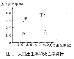 图1中甲、乙、丙、丁分别表示不同的国家。读图完成1一3题。