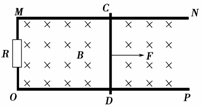 (13分)如图所示,电阻不计的平行金属导轨MN和OP放置在水平面内.MO间接有阻值为R=3 Ω的电阻.导轨相距d=1 m,其间有竖直向下的匀强磁场,磁感应强度B=0.5 T.质量为m=0.1 kg,电阻为r=1 Ω的导体棒CD垂直于导轨放置,并接触良好.用平行于MN的恒力F=1 N向右拉动CD.CD受摩擦阻力f恒为0.5 N.求: