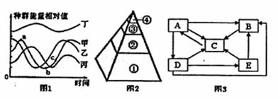 (1)图2能量金字塔中各营养级对应于图1的名称:① ;② ;如果大量捕杀丙,则甲的数量在较长一段时间内的变化过程是 。