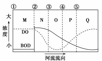 (2008年高考宁夏文综卷)溶解氧DO是指溶解于水中的氧的含量,是衡量水质的重要指标。生化需氧量BOD是微生物分解水中的有机物体时需要消耗氧的数量,它用于监测水体有机物的污染状况。下图为某河由M河段至Q河段水中溶解氧和生化需氧量浓度变化曲线。据此完成4-5题。