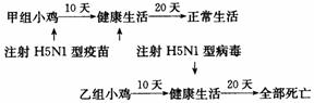 (2009南京质检)科学家初步研制出H5N1型禽流感疫苗,应用前必须进行动物实验检测其效果,将未感染H5N1型病毒的一群健康小鸡分为甲、乙两组,实验过程和结果如下图所示。下列相关分析错误的是