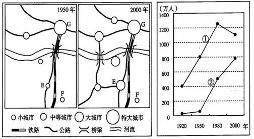 (图24)某地区城市发展变化示意图 (图25)两城市人口变化