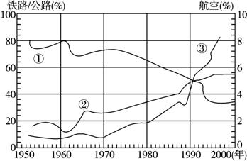 读我国各交通运输方式在客运周转量中份额的变化图,完成1~2题。