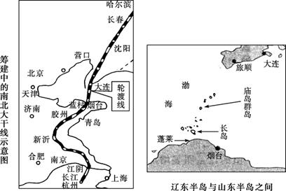 13.渤海海峡可供选择的跨海运输方案主要有轮船运输、火车轮渡、海底隧道、桥隧通道4种,其中桥隧通道方案即蓬莱-长岛架桥、长岛-旅顺修隧道。目前,连接我国东北和华东的南北大干线在过渤海海峡时,通过建设我国最长的跨海铁路轮渡工程--烟(台)大(连)铁路轮渡已经实现(如下图)。读图回答下列问题。
