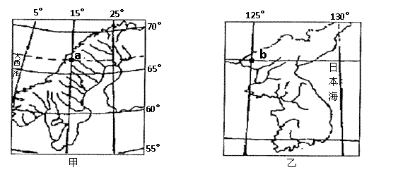 .两图所示地区属于同一个大洲 B.a位于b的东北
