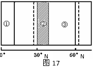 图17为某日“北半球部分气压带、风带分布示意图”,其中①、②、③分别代表气压带或风带。读图完成35-37题。