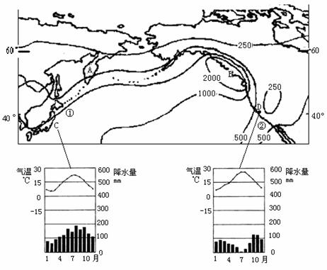 (2)比较图中C、D两地气候特征的差异,分析其形成原因(5分)