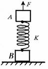 (13分)一个劲度系数为K=800N/m的轻弹簧,两端分别连接着质量均为m=12kg物体A和B,将它们竖直静止地放在水平地面上,如图所示。施加一竖直向上的变力F在物体A上,使物体A从静止开始向上做匀加速运动,当t=0.4s时物体B刚离开地面(设整个匀加速过程弹簧都处于弹性限度内,取g=10m/s2).求: