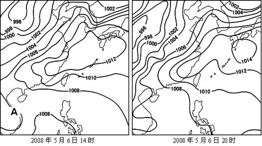 下图是亚洲东部某区域两个时刻的等压线图(单位:百帕),读图回答17-18题。