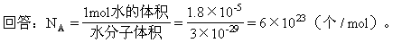 如果已经知道分子的大小,不难粗略算出阿伏伽德罗常数。例如,1mol水的质量是0.018kg,体积是1.8×10-5m3。每个水分子的直径是4×10-10m,它的体积是(4×10-10)m3=3×10-29m3。如果设想水分子是一个挨着一个排列的。