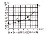 图3为某日观测到的同一经线上不同纬度的日出时刻(东十区区时)。此时,东十区区时为12时。读图回答
