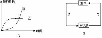 21. 下图中,B图表示有关激素的调节机制,A图是某同学研究碘对蝌蚪发育的影响而得出身长变化的甲、乙两曲线。两图中表示蝌蚪正常发育的曲线和含碘的激素物质分别是