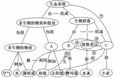 (1)图中A代表的是_________,B代表的是_________,图中C代表的是_________,写出连线⑥上的联系词_________。