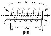 ○通电螺线管磁场的磁感线:和条形磁铁外部的磁感线相似,一端相当于南极,一端相当于北极;内部的磁感线和螺线管的轴线平行,方向由南极指向北极,并和外部的磁感线连接,形成一些环绕电流的闭合曲线(图5)