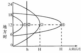 下图中①②③④四条线分别表示北半球夏半年某日四地的太阳高度变化过程,读图后回答18-19题(h为一已知量)