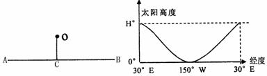 AB为晨昏线,O处有一旗杆为5米,且该日旗杆影长始终不变为18.5米,并作顺时针旋转,C处所在整条纬线此刻的太阳高度角分布如右图所示,已知tan15°=0.27、