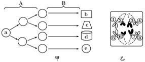 (1)甲图A表示的是 过程,B表示的是 过程。乙图处于有丝分裂的 期。