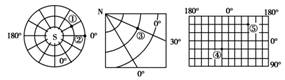 3.读三幅经纬网示意图,①-⑤各地地理坐标相同的是 ( )