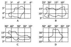 6.以下四幅经纬网图中,比例尺最大的一幅是 ( )