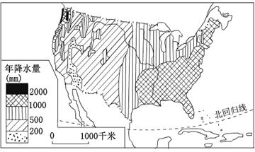 (1)试分析美国中东部降水的空间分布特点及形成原因。(4分)