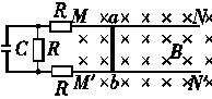 两根光滑的长直金属导轨MN、M′N′平行置于同一水平面内,导轨间距为l,电阻不计,M、M′处接有如图所示的电路,电路中各电阻的阻值均为R,电容器的电容为C.长度也为l、电阻为R的金属棒ab垂直于导轨放置,导轨处于磁感应强度为B、方向竖直向下的匀强磁场中.ab在外力作用下向右匀速运动且与导轨保持良好接触,在ab运动距离为s的过程中,整个回路中产生的焦耳热为Q.求: