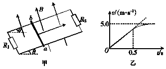 6.如图甲所示,两根足够长的光滑水平金属导轨相距L=0.40 m,导轨平面与水平面成θ=30°角,上端和下端通过导线分别连接阻值R1=R2=1.2 Ω的电阻,质量m=0.20 kg、阻值r=0.20 Ω的金属棒ab放在两导轨上,棒与导轨垂直并保持良好的接触,整个装置处在垂直导轨平面向上的匀强磁场中,磁感应强度大小B=1 T.现通过小电动机对金属棒施加拉力,使金属棒沿导轨向上做匀加速直线运动,0.5 s时电动机达到额定功率,此后电动机的功率保持不变,经足够长的时间后,金属棒达到最大速度vm=5.0 m/s.在此过程中,金属棒运动的v-t图象如图乙所示,试求:(取重力加速度g=10 m/s2)