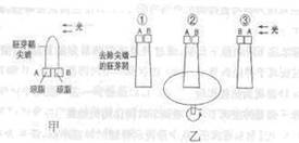 33.下图中甲表示对燕麦胚芽鞘所做的处理,乙表示将处理后的琼脂块分别放置在去除尖端的胚芽鞘上的三种处理方式,一段时间后①、②、③的生长情况依次是 ( )
