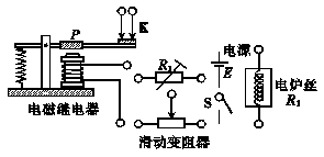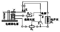 工作过程:闭合开关S,当温度低于设计值时热敏电阻的阻值大,通过电磁继电器的电流较小不能使它吸下P,K接通,电炉丝加热;当温度达到设计值时,热敏电阻的阻值减小到某值,通过电磁继电器的电流达到工作电流,K断开,电炉丝断电,停止供热.当温度低于设计值时,又重复前述过程.