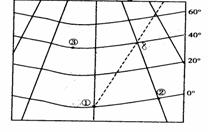 读下面的经纬网图,图中虚线是地球公转到近日点的晨昏线,①点以西是西半球,以东是东半球。①点与②点之间的经度差是30度。回答10---11题。![]()