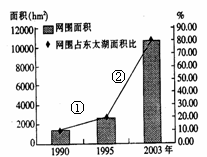 (2)图中太湖流域为发展农业,大力发展网围养殖,却造成了东太湖面积的持续缩小,右图是“太湖网围养殖数量变化图”,据图说出图中_______阶段(①、②)是该地区湖泊面积快速消失的时期,并列举出由此引发的环境问题。(7分)