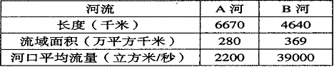 (3)、B河地处热带雨林地区,A河位于热带草原和热带沙漠地区(B河所在地区的降水量比A河丰富);B河位于世界最大盆地刚果盆地.A河流域面积相对较小(B河流域面积大于A河)。