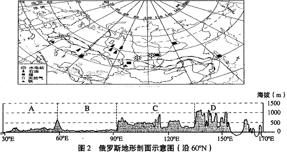 (1).在“俄罗斯地形剖面示意图”上,字母A、B代表的地形区名称分别是________________;字母c、D代表的地形区名称分别是______________________________________________。据此判断,俄罗斯地形的东西分界线是_____________河。